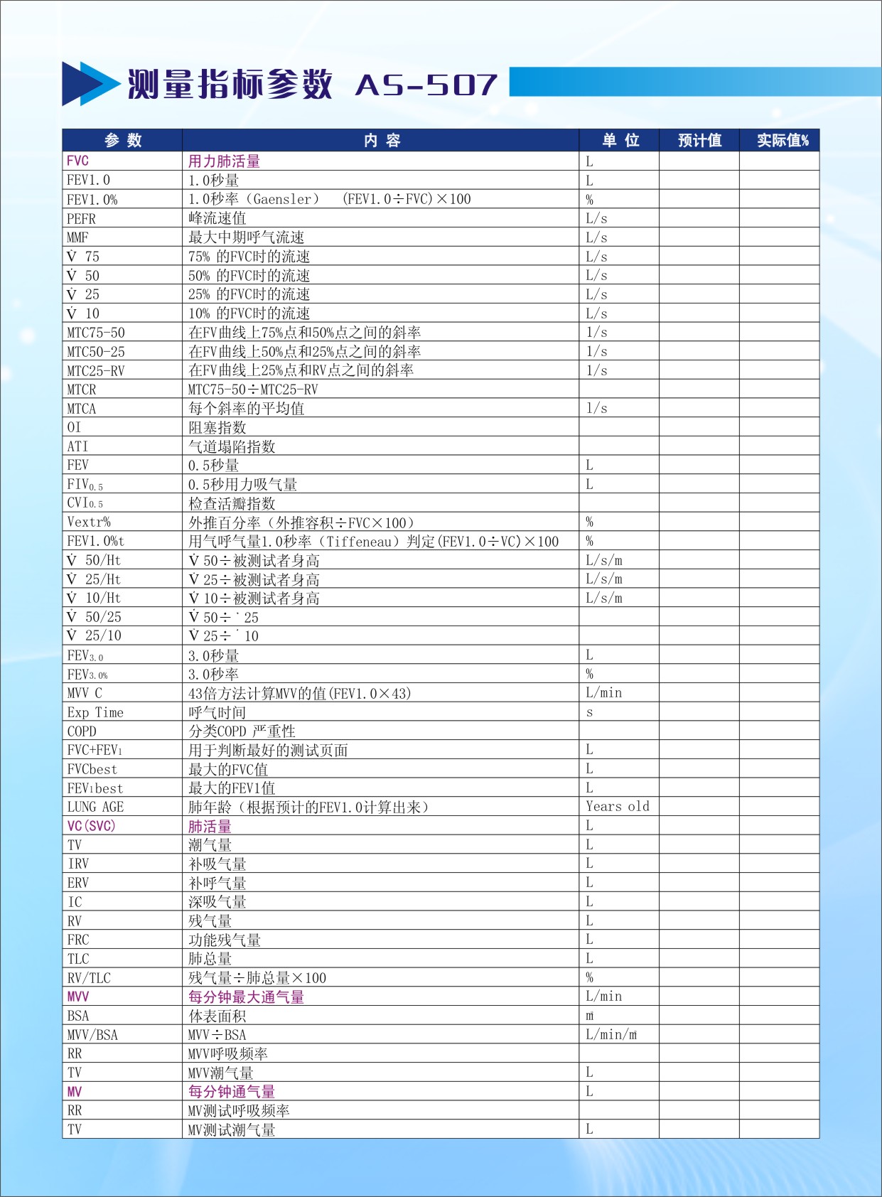 1、用力肺活量(FVC):FVC,FEV1.0,FEV1.0%,PEFR,MMF, 75, 50, 25, 10, MTC75-50,MTC50-25,MTC25-RV,MTCR,MTCA,OI,ATI,FEV0.5,FIV0.5,CVI,Vextr%,FEV1.0%t, 50/Ht, 25/Ht, 10/Ht, 50/25, 25/10,FEV3.0,FEV3.0%,MVV C,Exp Time,COPD,FVC+FEV1,FVC best,FEV1best,LUNG AGE